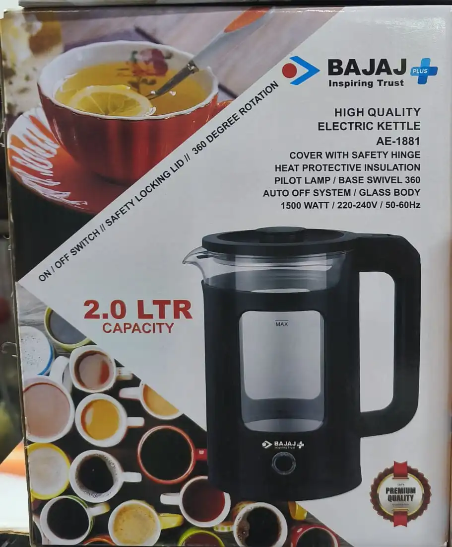 A sleek 2L glass electric kettle with double-layer insulation for safety and heat retention. Features fast boiling technology, durable glass body, ergonomic handle, and automatic shut-off for convenience. Ideal for modern kitchens, offices, and everyday use